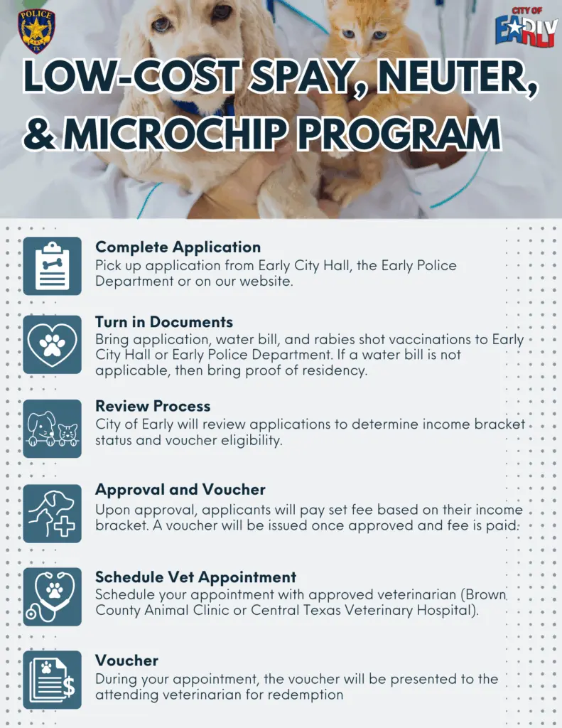For more information please visit https://earlytx.net/394/Low-Cost-Spay-Neuter-Microchip-Program or call us at (325) 643-5451 Early City Hall or Early Police Department (325) 646-5322.