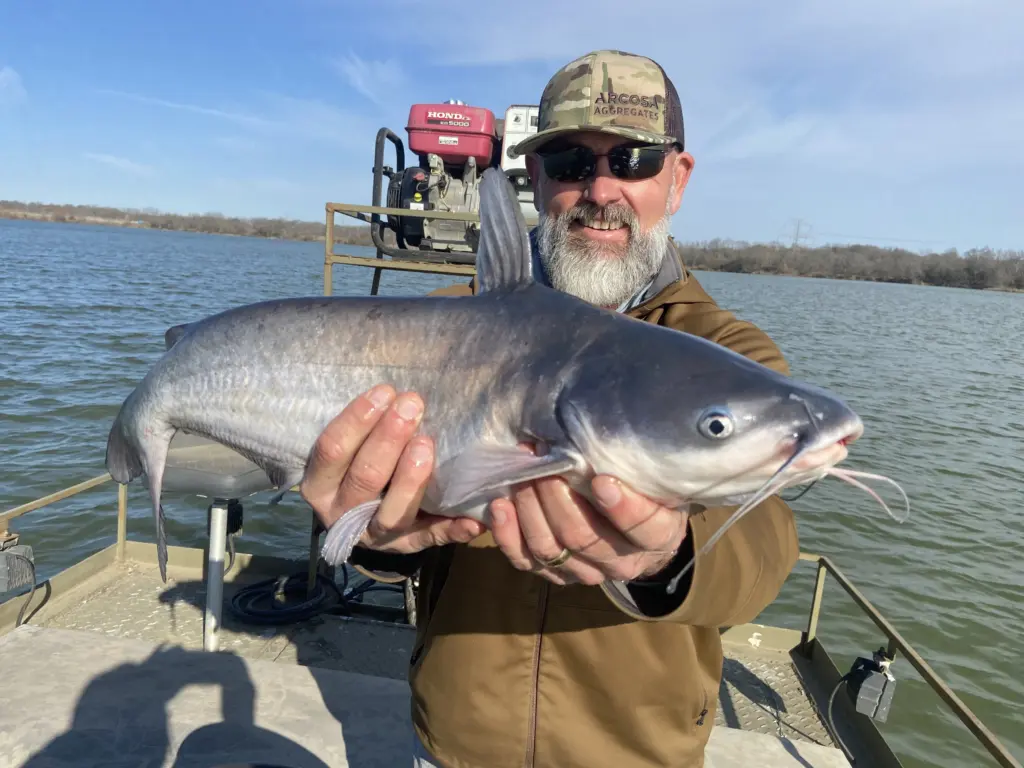 NOW TO THE FISHING- My friend’s lake is comprised of over a couple hundred acres, actually a giant gravel pit that was created back in the fifties. As is common with most gravel pits, the excavation process left a very irregular bottom. There are areas in the lake that are very shallow and spots with deep water, ideal habitat for all sorts of fish but especially blue and channel catfish. The river is not far away and during periods of floods and high water, the lake has been stocked with blue catfish through the years. Blue catfish in such a larger watershed will also spawn which ensures a good supply of these good eating catfish.