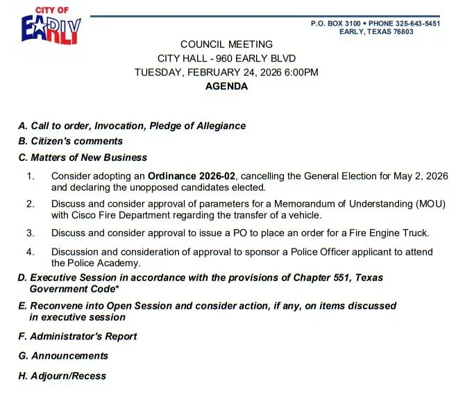 Early City Council to convene Feb. 24 February 18, 2026 at 5:46 pm Updated: February 19th, 2026 at 5:51 am Derrick Stuckly Announcements Local News Tweet Share Reddit +1 Pocket LinkedIn