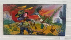 Selected by many of the nearly 950 visitors to the exhibit, this vibrant painting depicts a gun-toting cowboy mouse, pulling his saddled roadrunner across the New Mexico Desert.