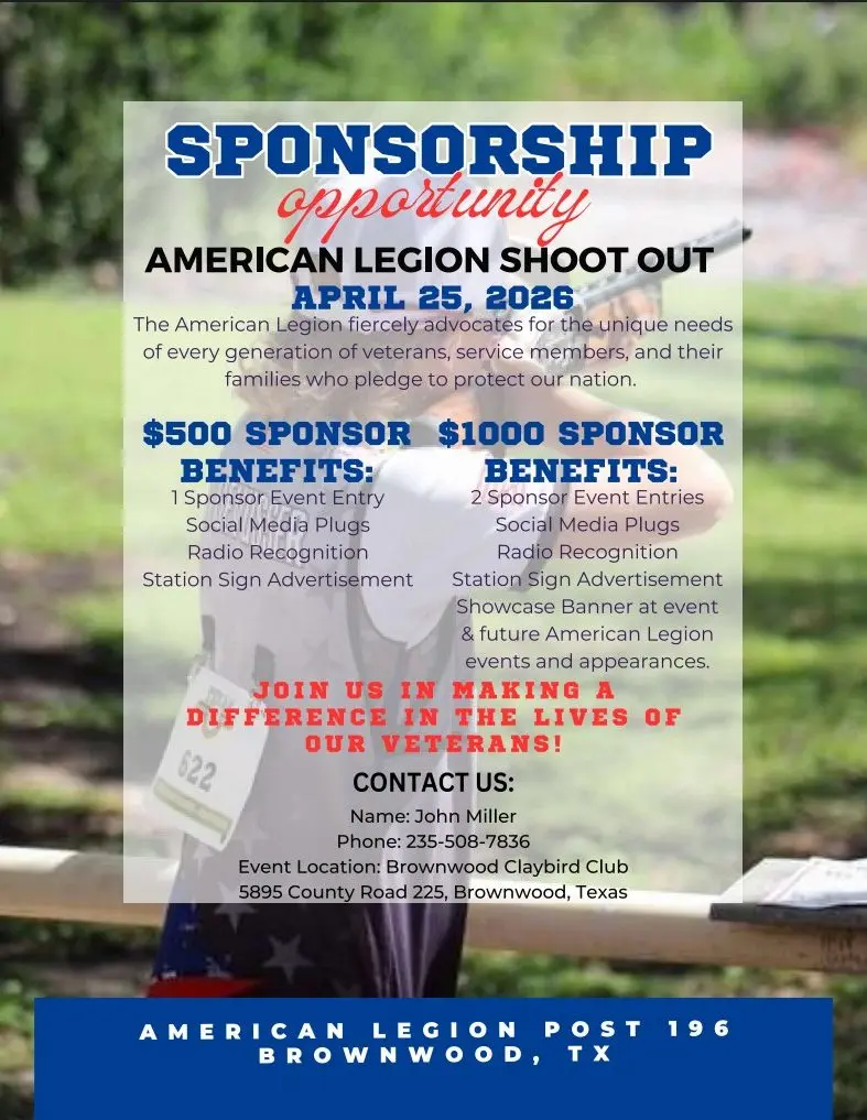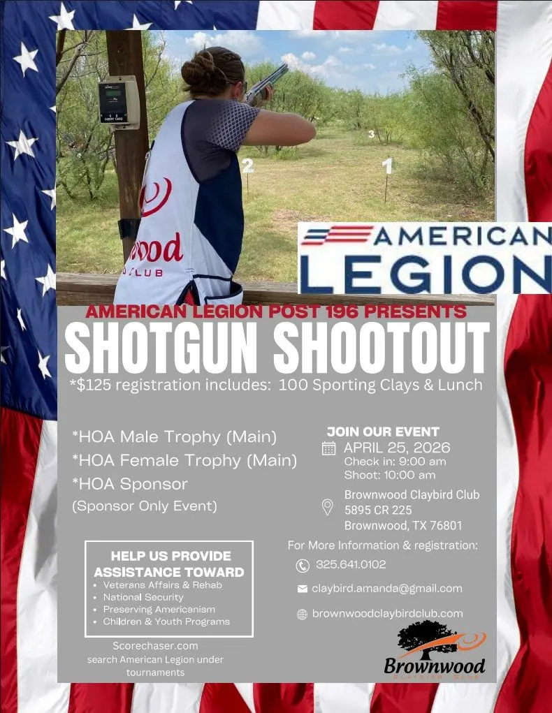 American Legion Post 196 benefit event at Brownwood Claybird Club April 25 February 23, 2026 at 1:18 pm Derrick Stuckly Local News Tweet Share Reddit +1 Pocket LinkedIn