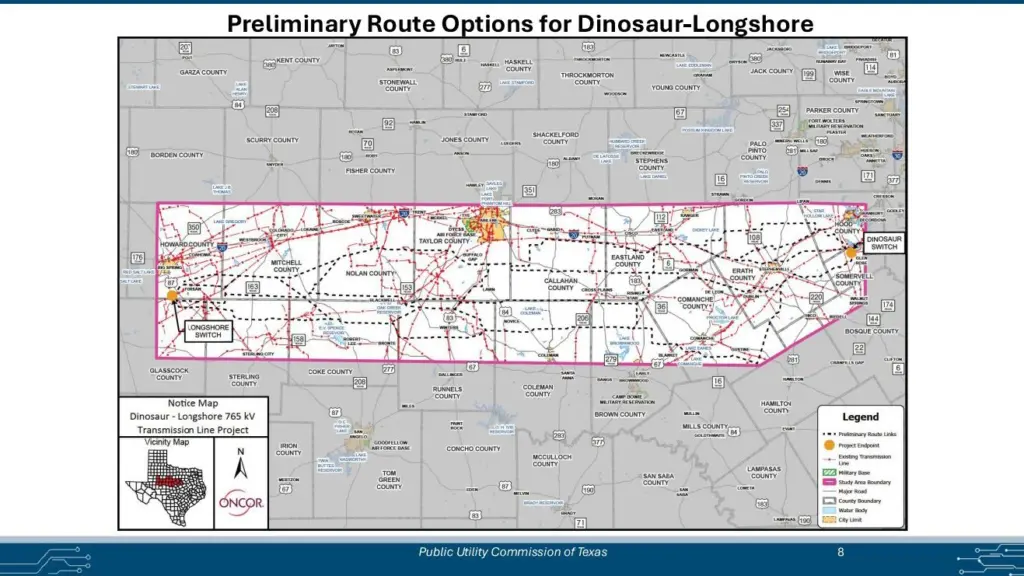 The Oncor Electric Delivery Company has proposed a new electricity transmission line called the Dinosaur-Longshore Transmission Line, which might cross through Brown County.  The line would send 765 kV of electricity from Somervall County, near Glen Rose, about 250-miles west to Howard County, near Forsan.  A number of possible routes have been proposed, two of which would cross northern Brown County.  The Oncor web site says the new line would address “surging demand in high growth areas, including the record-growing West Texas region.”  The web site also says “These lines reduce grid congestion and planned outages, especially during extreme weather/demand.  That means more effective and efficient power delivery for homes and businesses.”