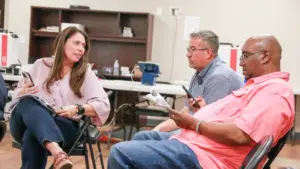 From left: Brown County Attorney Jennifer Broughton; John Hunter, who finished first in a three-way race for Precinct 4 justice of the peace; and Precinct 2 Justice of the Peace Harold Hogan visit near the end of the election returns Tuesday night in the Brown County Elections Office.