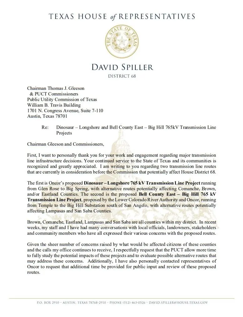 State Representative David Spiller has requested more time for the selection of the route of a proposed electrical power line that would run through the District 68 that he represents in the Texas Legislature.
