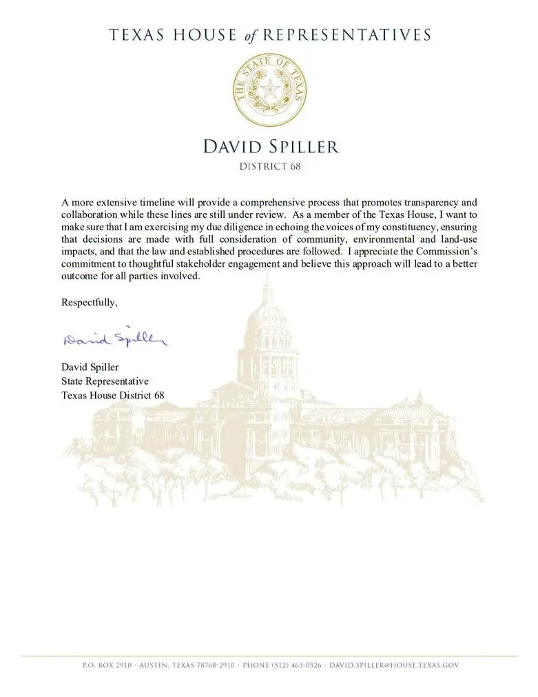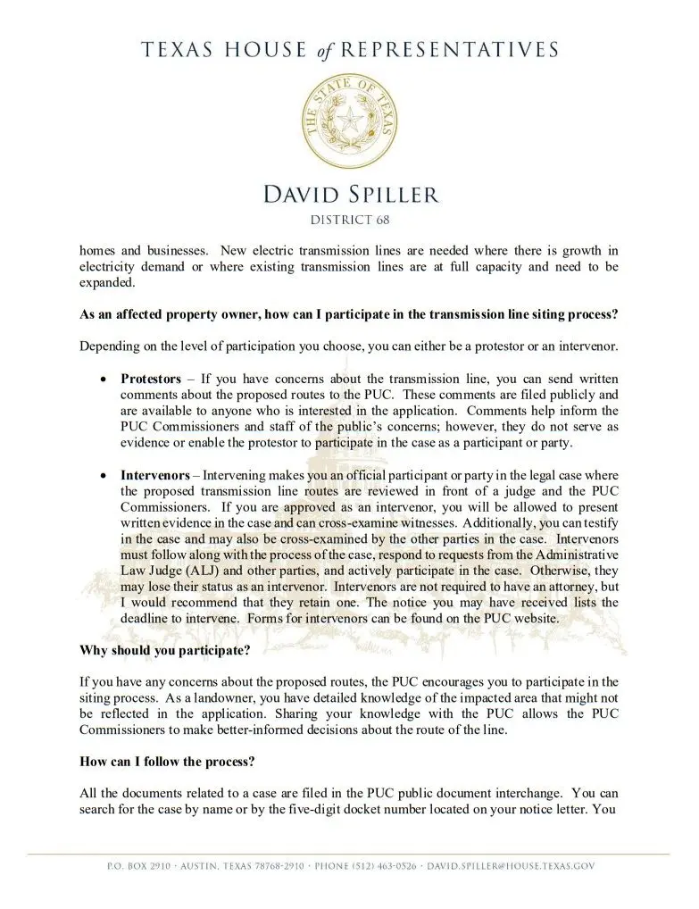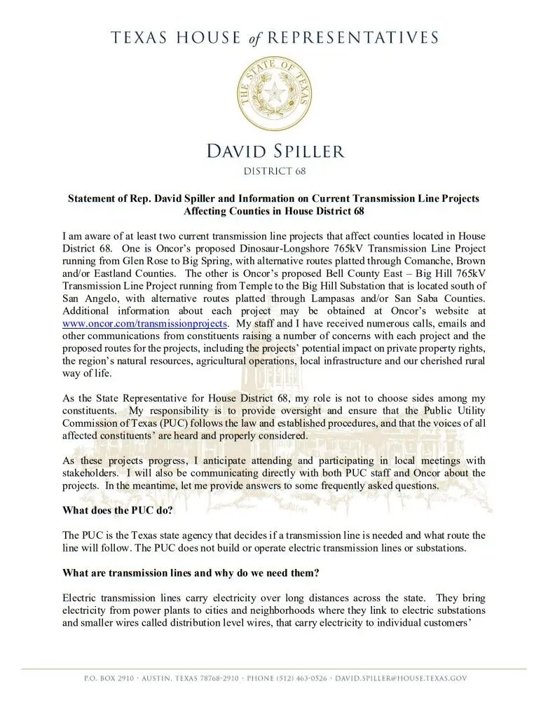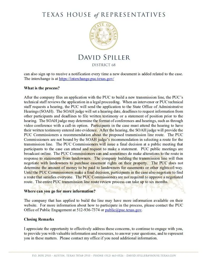 Attached below are a letter from Representative Spiller to the Chairman of the Public Utility Commission of Texas, and a statement from Spiller which explains how the process works.