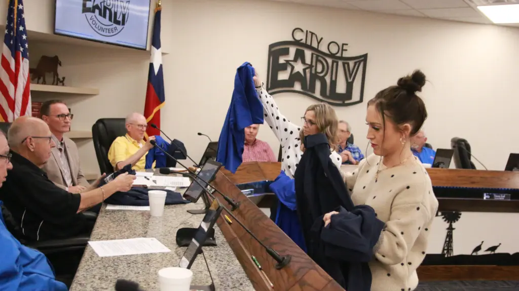 Early Executive Assistant Sydney Turner (foreground) and City Secretary Brenda Kilgo give council members T shirts with the words “Volunteer” in recognition of the new ‘I Am Early’ program.