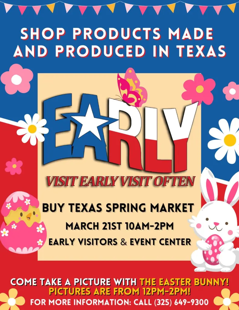 The next Buy Texas Holiday Market will be this Saturday, March 21, from 10 AM until 2 PM @ the Early Visitors & Events Center. The Easter Bunny will hop around for pictures from 12 PM – 2 PM.