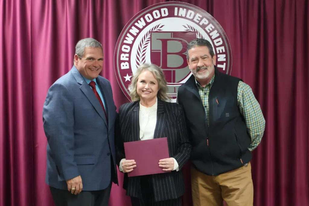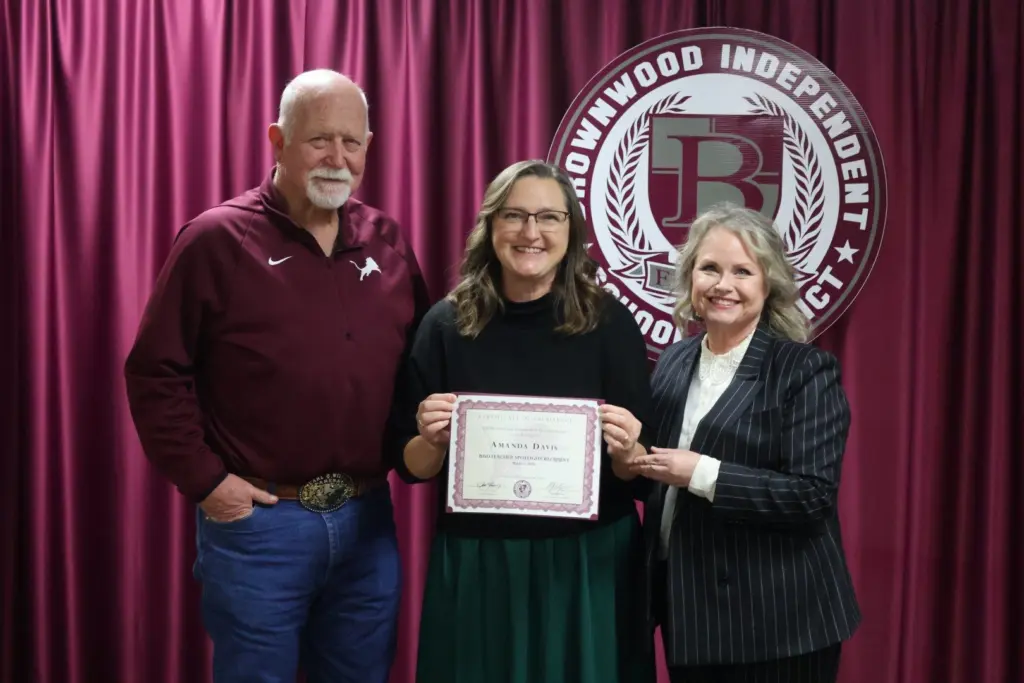 East Elementary’s Principal Christi Burks was recognized for being named TEPSA’s 2026 Region 15 TEPSAN of the Year. Pictured below are BISD Superintendent Dr. Joe Young, East Elementary Principal Christi Burks, and Trustee Cloy.