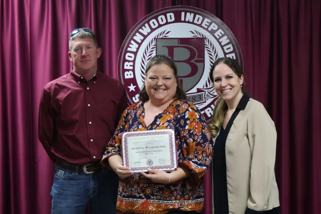 The BISD Spotlight recognizes members of the faculty and staff who go the extra mile to ensure excellence in education for all BISD students. Spotlight recipients are chosen from peer nominations and awards are provided through a sponsorship by Jacobs Family Pharmacy and Brownwood Education Foundation. March 2026 honorees were East Elementary fourth-grade RLA teacher Amanda Davis and Brownwood High School (BHS) Behavior Teacher Aide Shawna Washington. Spotlight honorees are pictured with (top) BISD Trustee Tim Wilson and East Elementary Principal Christi Burks, and (bottom) BISD Trustee Justin Posey and BHS Principal Lindsay Smith.
