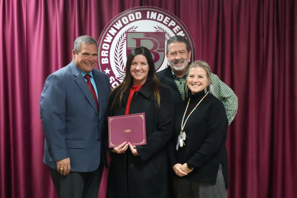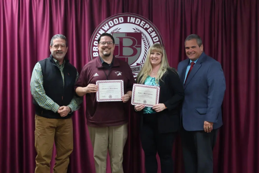 BISD earned three Star Awards for distinguished achievement at the TSPRA conference: Silver STAR Awards included “The Beating Heart of The Friday Night Lights” a published news article written by Sara Musgrove, and a Brownwood High School A/V & Photography promo video filmed by BHS Media Crew students and edited by BISD Community Relations Coordinator Charles Musgrove. A Gold STAR Award was received for the Multi-Purpose Activity Center large banner designs featuring Brownwood Lion and Lady Lion athletes. Pictured below are Trustee Cloy, BISD Community Relations Coordinator Charles Musgrove, Author Sara Musgrove, and BISD Superintendent Dr. Joe Young.