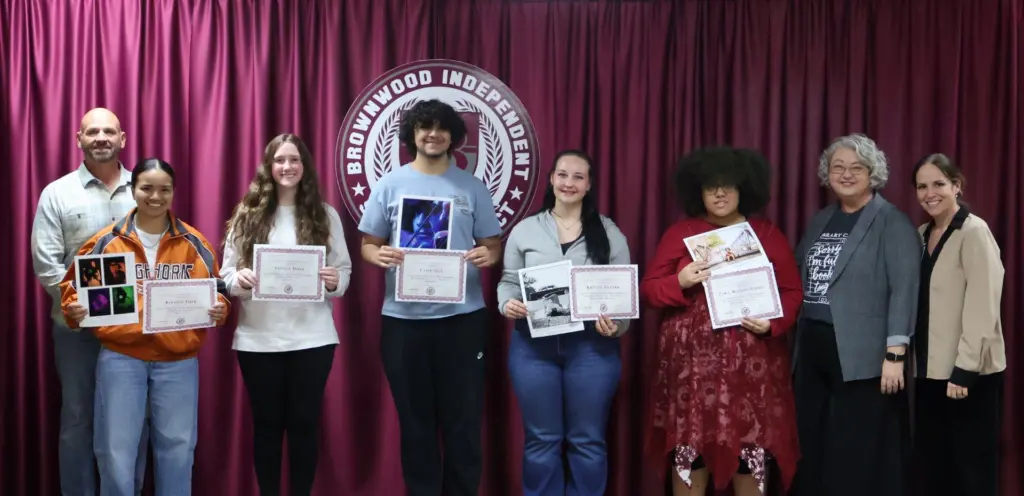 Several BHS photography students received recognition for awards earned at the Association of Texas Photography Conference. In the Environmental Self Portrait contest, Zara Matson-Sledge and Krysta Franks earned honorable mentions and Caleb Fell was awarded Superior. For the School Portrait contest, a submission by Adyson Duke, Brenely Duncan, Kirsten Fijer, and Janiva Fuentes earned second place. Honorees are pictured below with BISD Trustee Codie Smith, BHS Photography Teacher Heather Nix, and BHS Principal Lindsay Smith.
