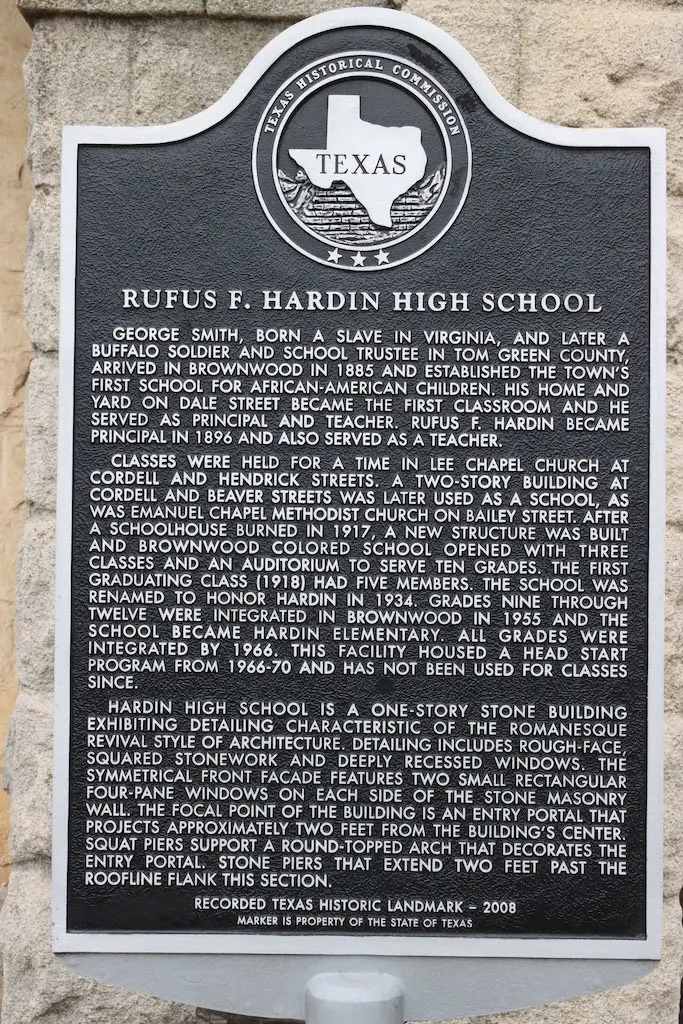 Known as the Brownwood Colored High School when it first opened in 1918, the segregation-era school went on to become R.F. Hardin High School and later the R.F. Hardin Elementary School. The Brownwood ISD closed the school in 1966 in compliance with the Civil Rights Act of 1964.