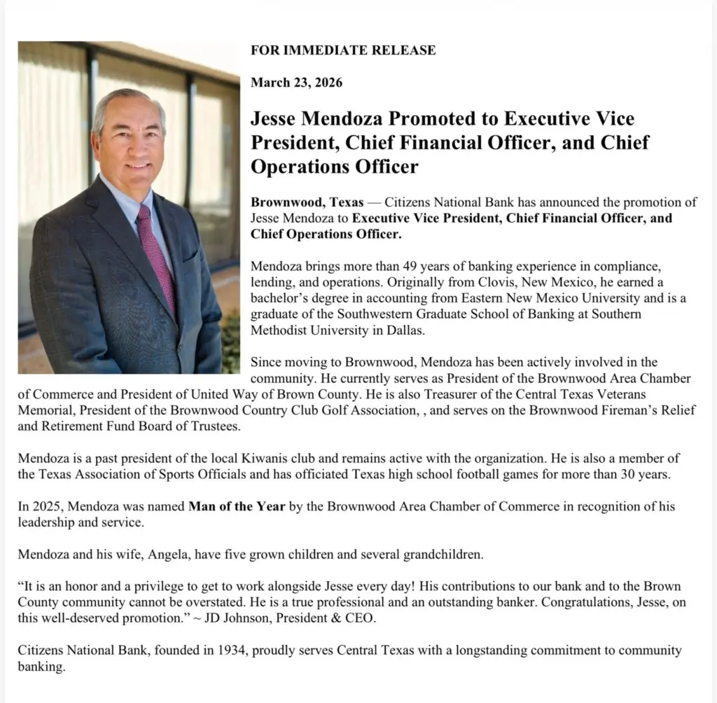 Citizens National Bank announces promotion of Jesse Mendoza March 23, 2026 at 11:46 am Derrick Stuckly Business Local News Tweet Share Reddit +1 Pocket LinkedIn