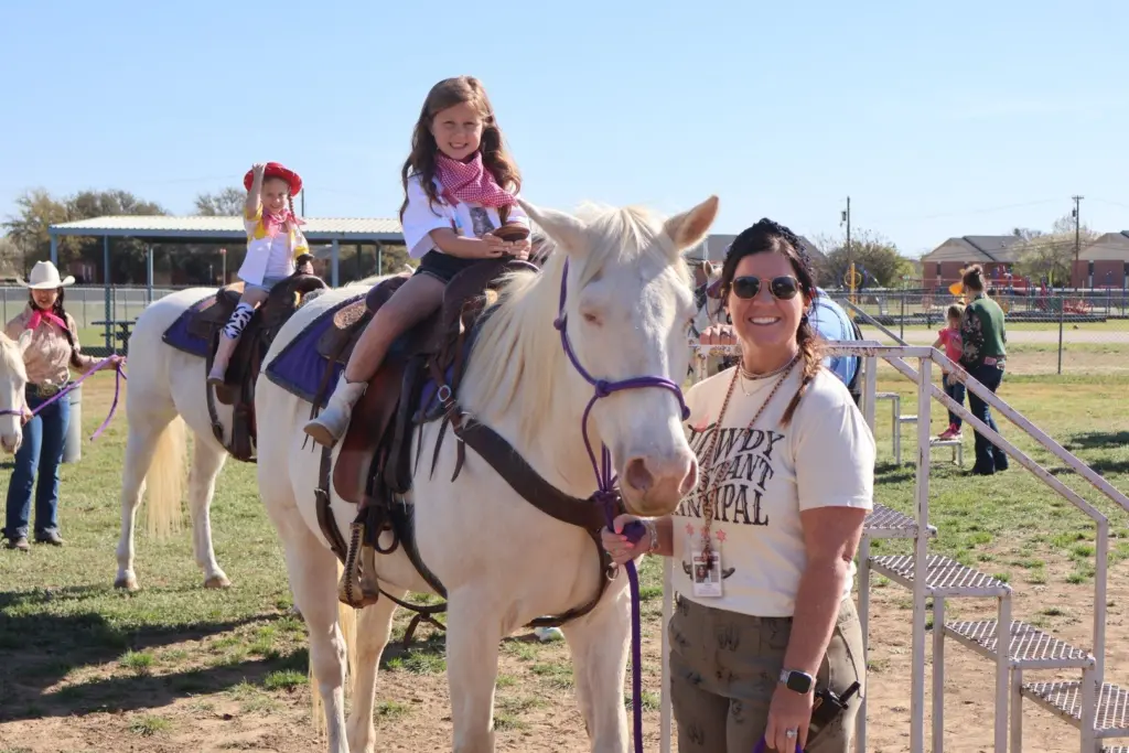 Zoey Ramirez rides a horse with Northwest Elementary Assistant Principal Shelby Vara holding the reigns.