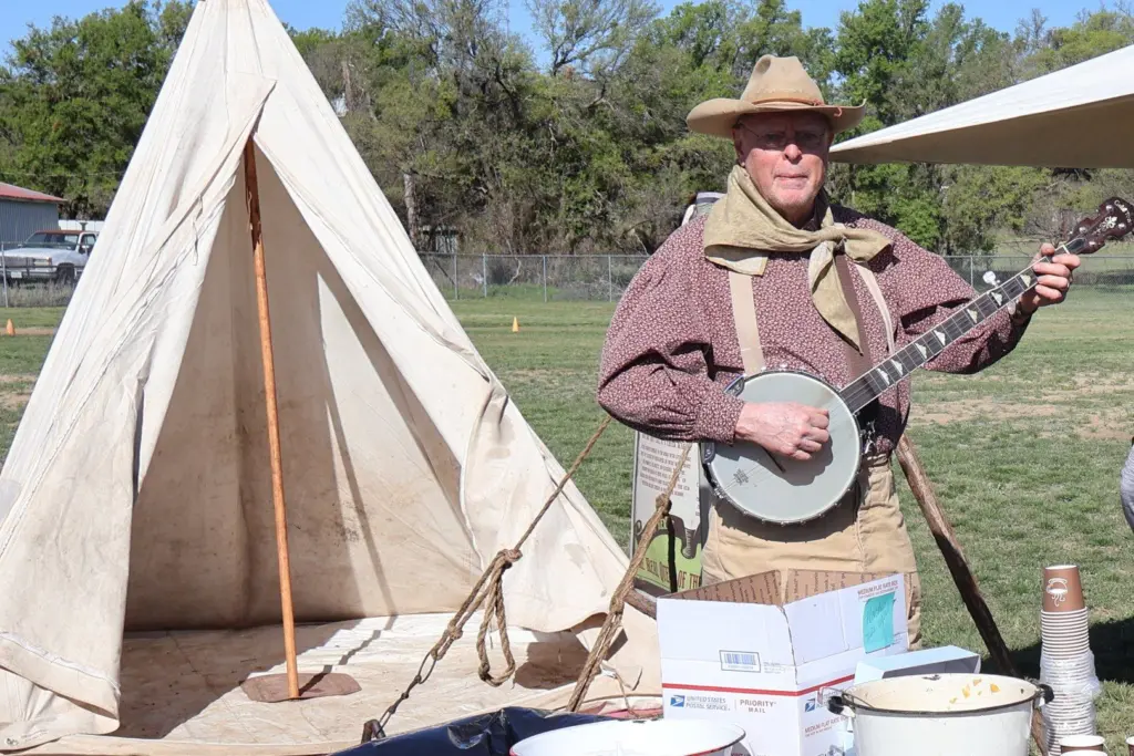 Jesse White picking the banjo during the Northwest Elementary Texas Day on Thursday, March 19.