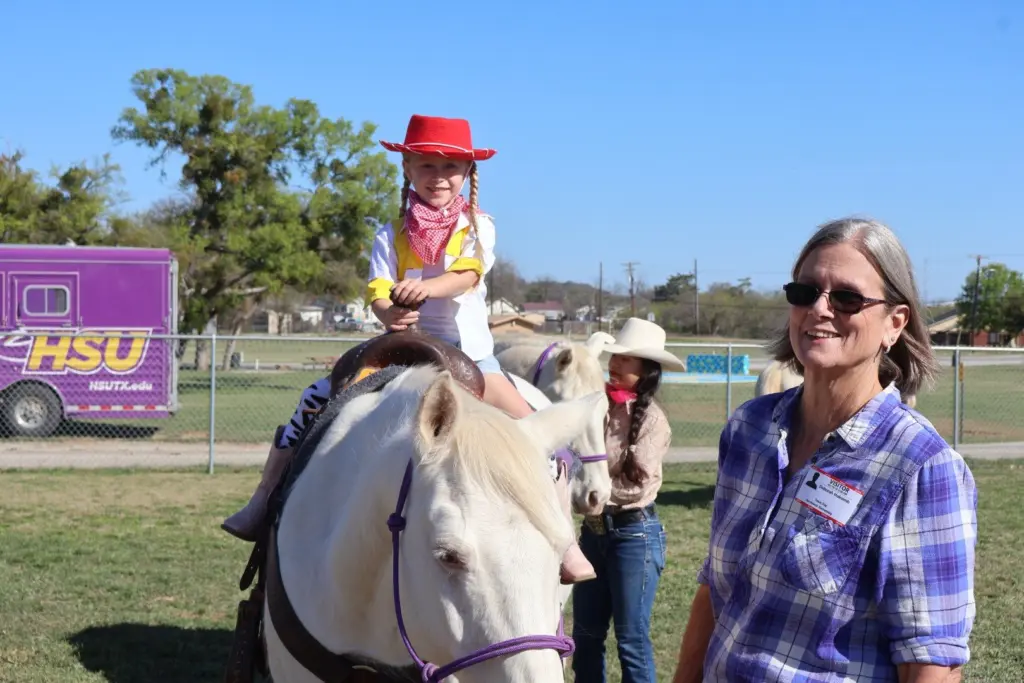 A variety of stations were set up around the Northwest Elementary campus: the chuckwagon, trick riding, horseback riding, hayrides, roping cattle, panning for gold, stick horse races, playing horseshoes, and corn hole practice. “The Chuckwagon station educated students about the food from pioneer days,” Morris said. “Another station included the Hardin Simmons Six White Horses. Each student had the opportunity to ride a horse, as well as learn the proper etiquette for mounting and dismounting from a horse.” HSU’s Six White Horses perform for the public in rodeos and parades, as well as for elementary students around the Texas Big Country, teaching them riding etiquette and appreciation for the animals. A banjo player provided atmosphere around the chuckwagon area. Lulu Bell Parr, known as the ‘Champion Lady Bucking Horse Rider of the World,’ performed wild west horse riding tricks.