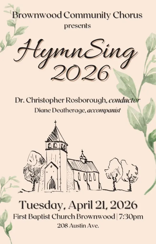 The Brownwood Community Chorus will present its annual HymnSing concert on Tuesday, April 21 at 7:30 p.m. in the sanctuary of First Baptist Church Brownwood. The Brownwood Community Chorus is comprised of Howard Payne students and local musicians.
