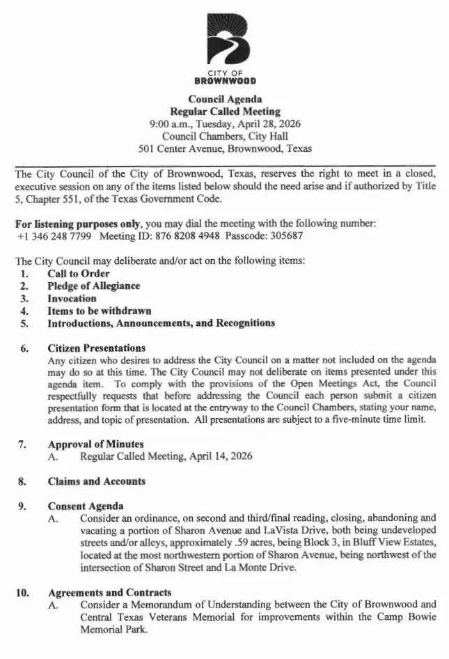 Brownwood City Council to convene April 28 April 22, 2026 at 6:27 pm Updated: April 23rd, 2026 at 2:24 pm Derrick Stuckly Announcements Local News Tweet Share Reddit +1 Pocket LinkedIn
