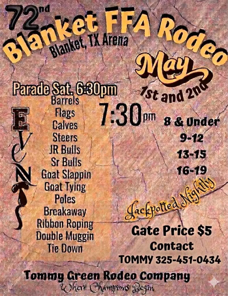 The 72nd Blanket FFA Rodeo will take place at 7:30 p.m. Friday, May 1 and Saturday, May 2 at the Blanket Rodeo Arena. The rodeo parade will be held at 6:30 p.m. Saturday.