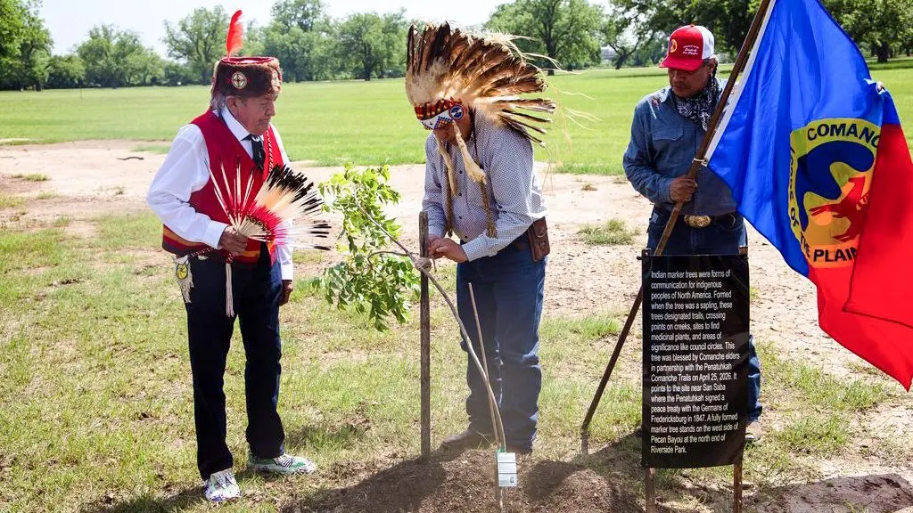 Elders bent and blessed a Indian Marker Tree. The tree points to the location near San Saba, where the 1847 Treaty between the Penatuhkah and Germans of Fredericksburg was signed.