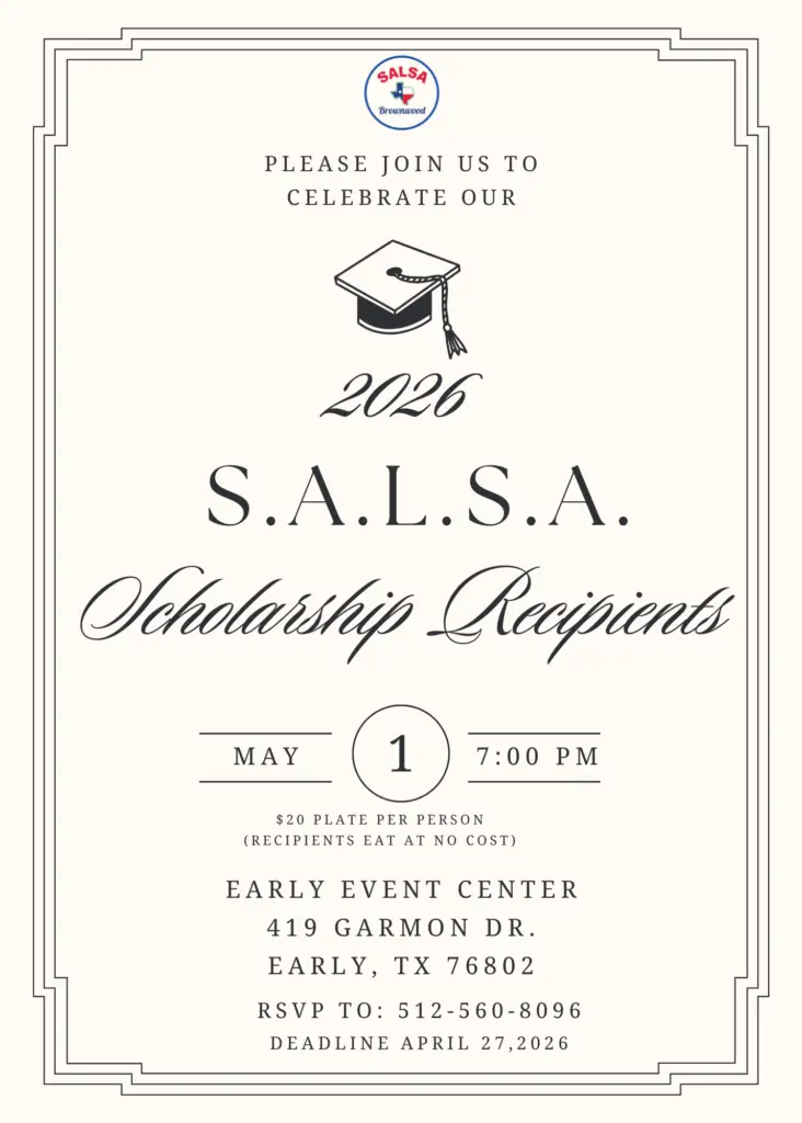 The SALSA organization will host a Scholarship Recipient Dinner on May 1 at 7:00 p.m. at the Early Event Center, celebrating the achievements of local students and the continued support of the community.