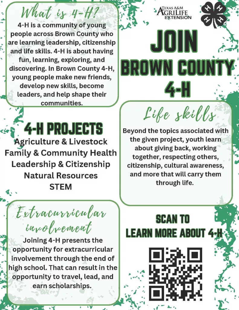 The 2025 District 7 4-H Leadership Lab will be held June 24th – 26th at Texas 4-H Conference Center in Brownwood, TX. You must be at least 13 years of age by the date of leadership lab to participate. The cost will be $250 per person for youth. This includes all meals beginning with lunch on Wednesday and ending with breakfast on Friday, insurance, activity fees, lodging and facility use fees. The deadline to register is May 19th on 4-H Online. If you are interested in participating in the district 7 4-H Leadership Lab, please contact the Extension Office.