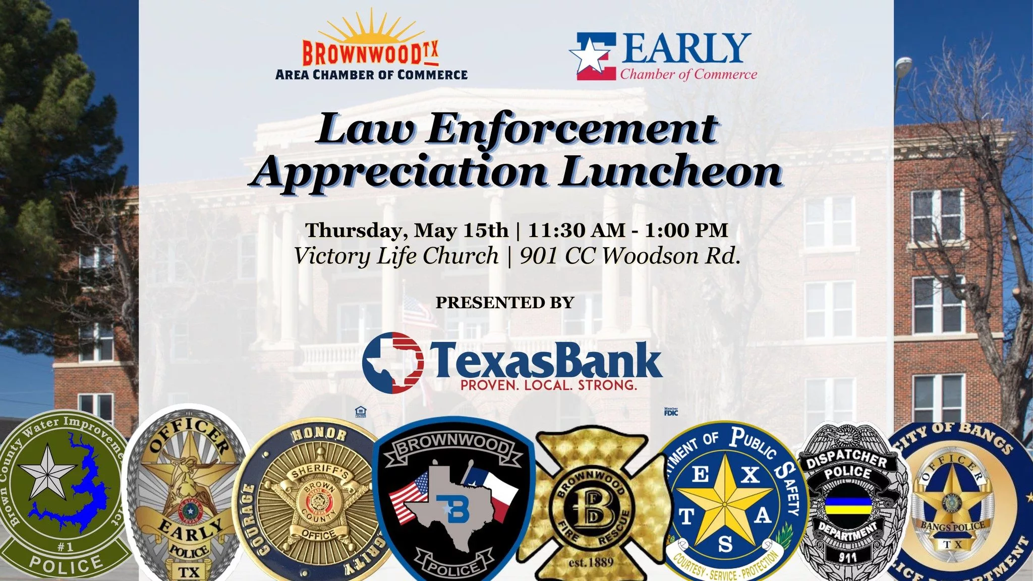 The Brownwood Area and Early Chamber of Commerce invite you to join them as they host the Annual Law Enforcement Appreciation Luncheon, presented by Texas Bank on Thursday, May 15th, 2025, at Victory Life Church of Brownwood. This annual event is their way of expressing a heartfelt THANK YOU to the brave men and women who serve in Law Enforcement, Emergency Response, and other essential community departments. These individuals work tirelessly—often behind the scenes and at great personal sacrifice—to keep our community safe, healthy, and supported. They are honored to welcome Texas Ranger Jason Shea as their Guest Speaker. With years of experience and service to the state of Texas, Ranger Shea brings a unique perspective and voice to this special event.