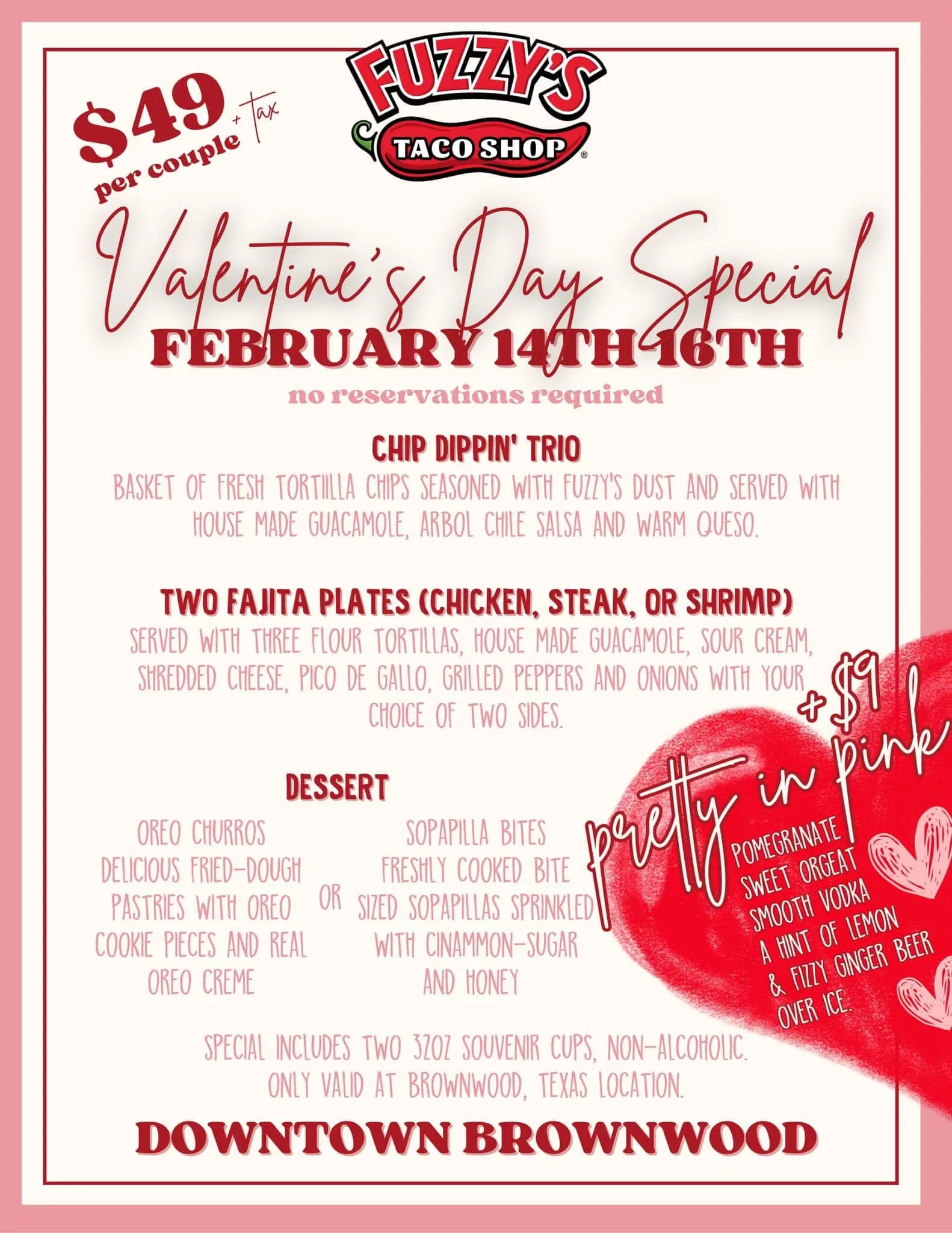 To add to the romance, Fuzzy’s Taco Shop will be running a Valentine’s Day special for couples from February 14-16th. Be sure to ask about themed drinks as well!
