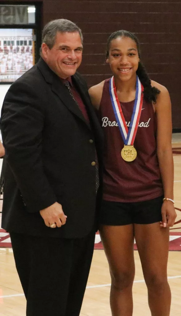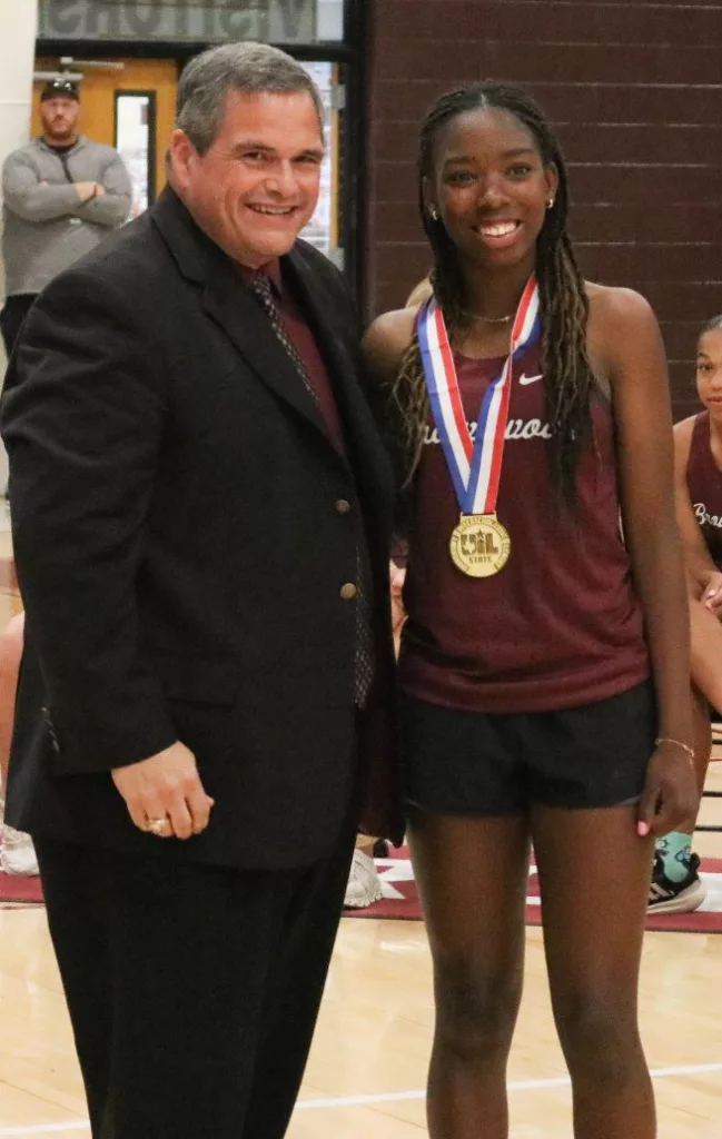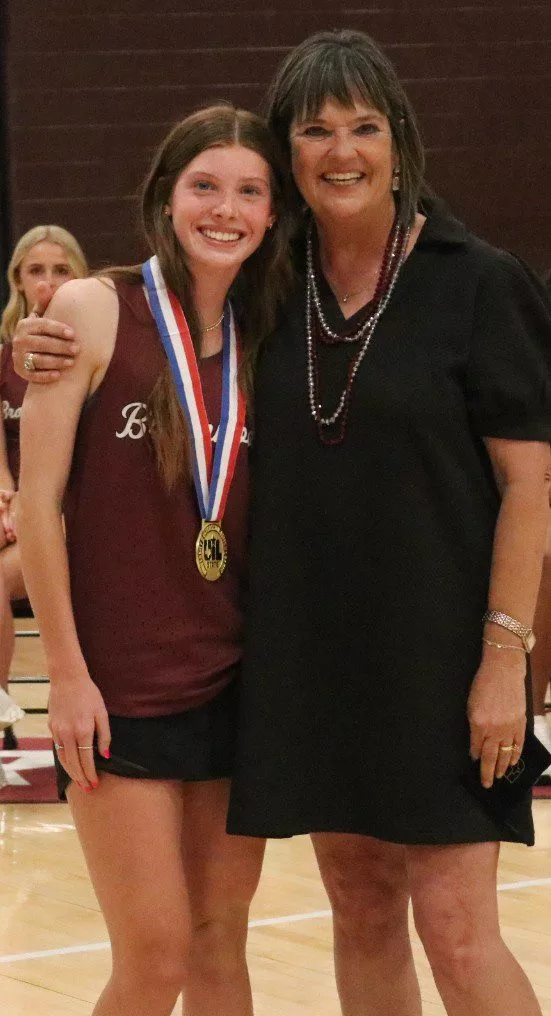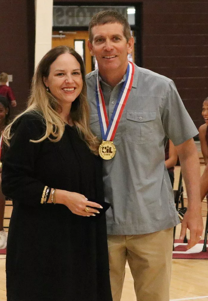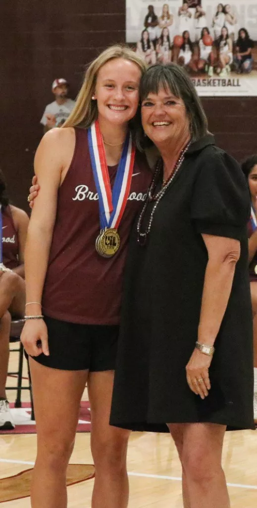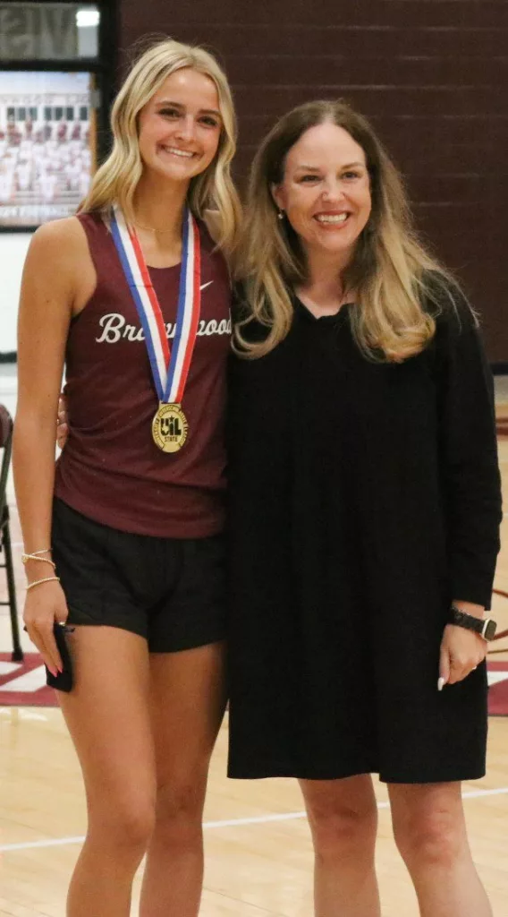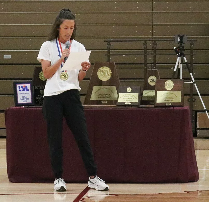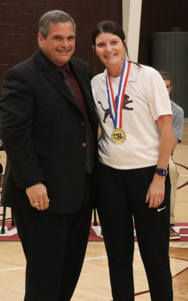 Athletic Director Mitch Moore introduced the members of the state championship roster – Hannah Deen, Rebekkah Delgado, Icess Hall, Aniah Hines, Braycee Lee, Jade Morin, Kaya Phillips, Kate Tindol, Sidney Windham, Inylah Hall, Grace Sparks, Jentry Coalson, Jaidyn Hope, manager Talia Craff, assistant coaches Bryan Clark and Heather Hohertz-Perez, and head coach Chelsy Lipsey – who then received UIL state championship gold medals from BISD Superintendent Dr. Joe Young, Deputy Superintendent Liesa Land and BHS Principal Lindsay Smith.