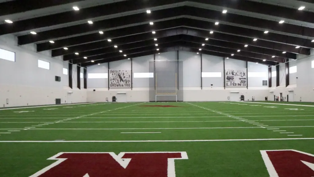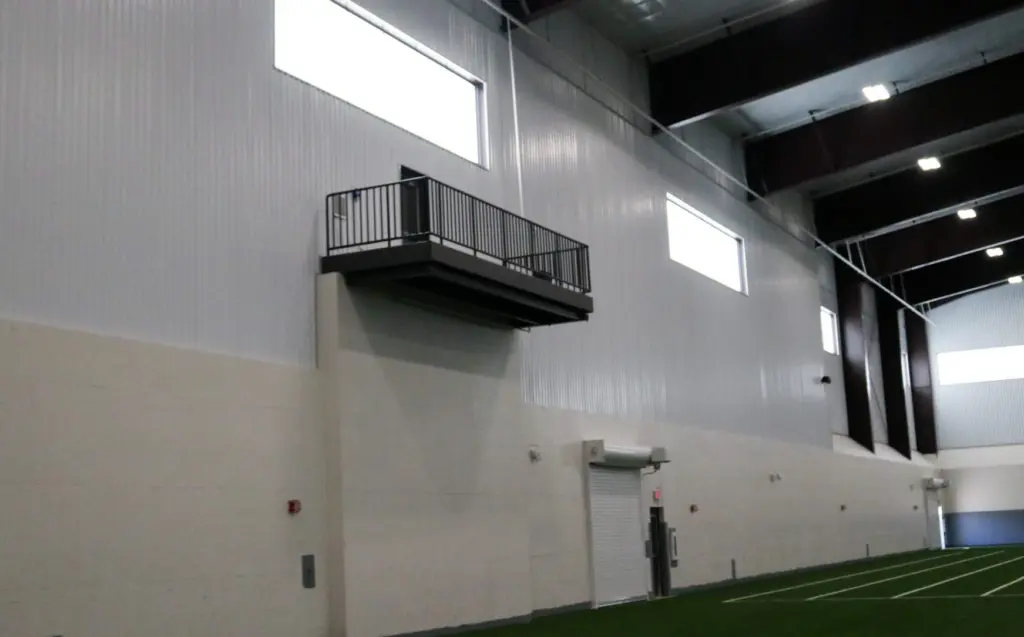 Along with a full length turf football field – which includes 15 yards of sideline for drills – there are roll down goal posts and soccer goals that can be used for practice, along with a platform overlook on the west wall.