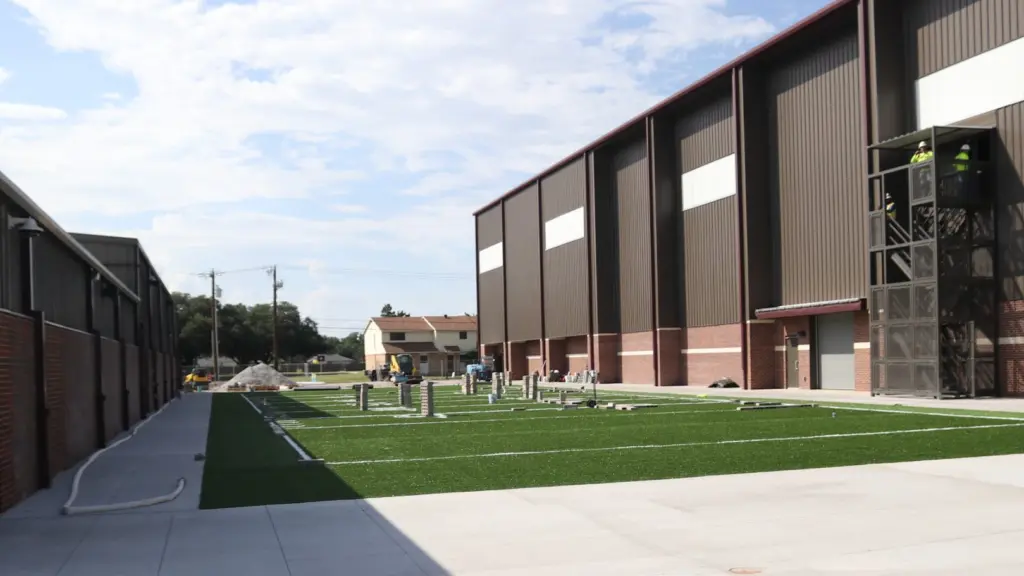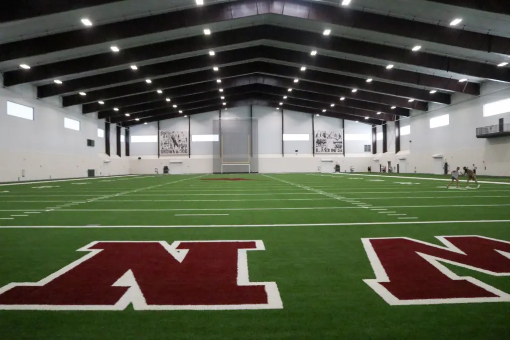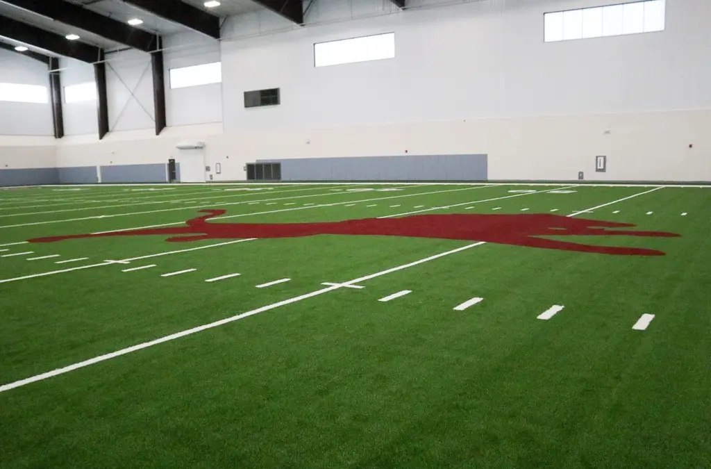 The inside side of the practice facility is completely turfed, matching the Hellas product that was installed at Gordon Wood Stadium prior to the 2024 football campaign.