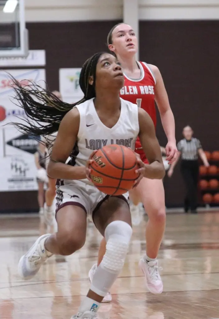 Trailing 8-5 with 2:14 left in the first period after a bucket by Harwell, Nylah Hall’s three-pointer allowed the Lady Lions to pull even at 8 at the end of the opening period. Glen Rose didn’t muster a point in the second period as Brownwood opened a 15-8 halftime advantage. With Lady Lions in front 18-8 with 1:51 to go in the third, Glen Rose finally ended its more than two-quarter scoring drought, then went on a 15-4 run to seize the lead.