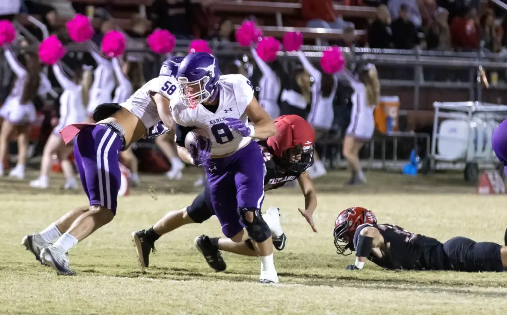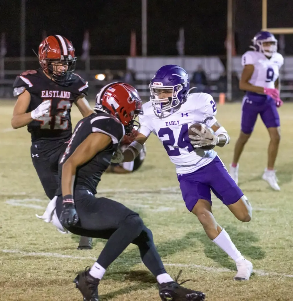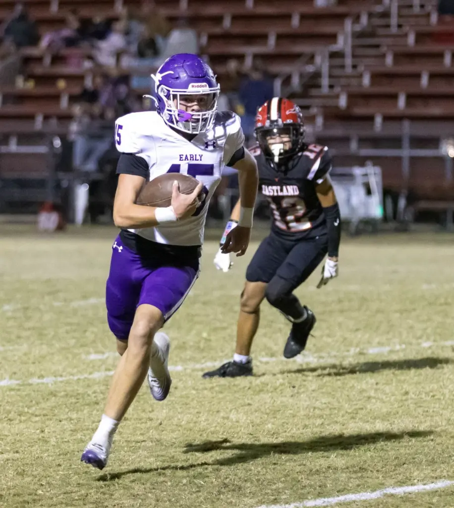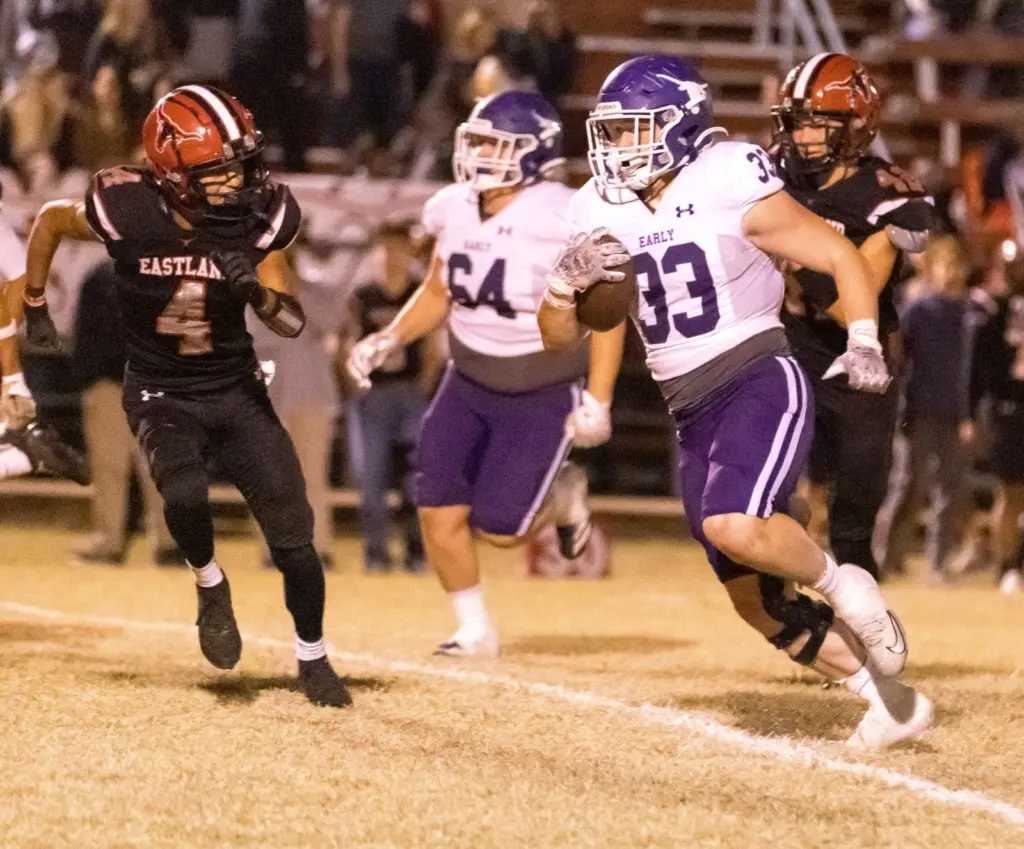 Early (4-5, 3-1) produced 452 yards of total offense – 254 rushing and 198 passing – against the Eastland (0-9, 0-4) defense. The Longhorns jumped out to a 29-0 lead after one quarter, which grew to 43-0 by halftime and 64-0 after three frames.