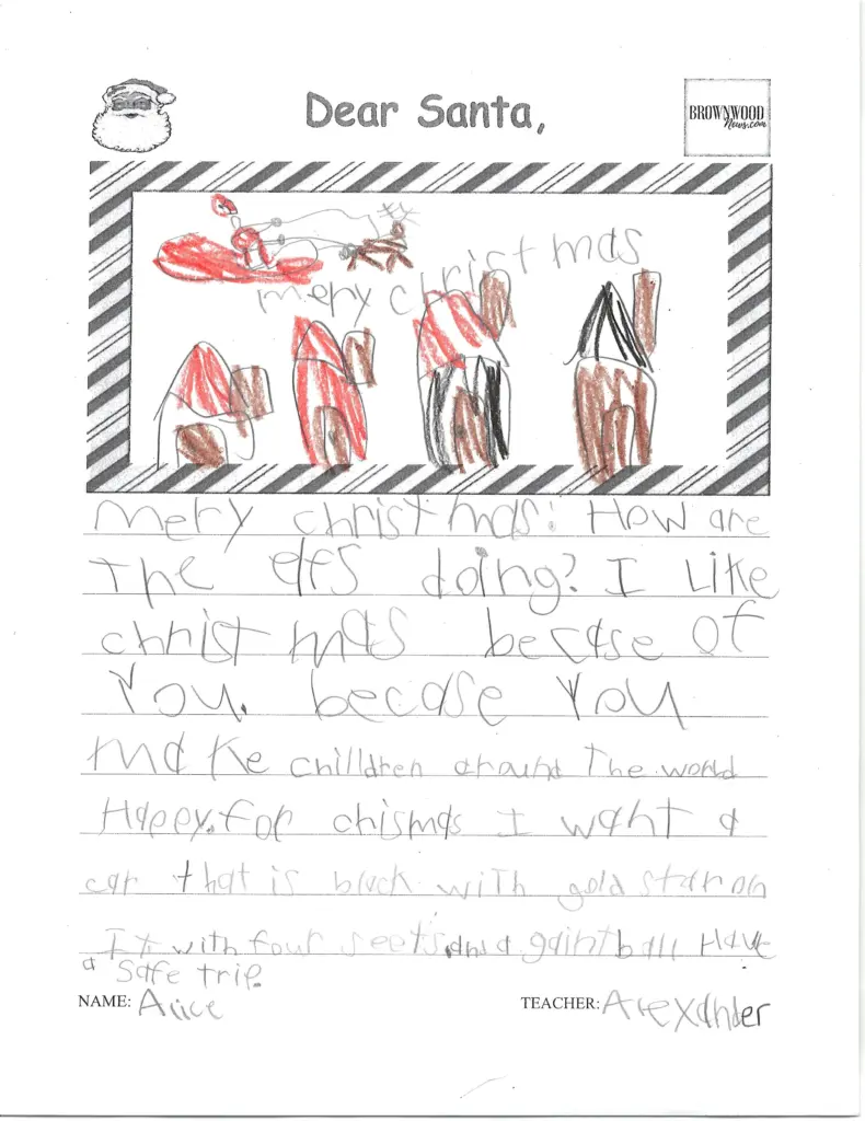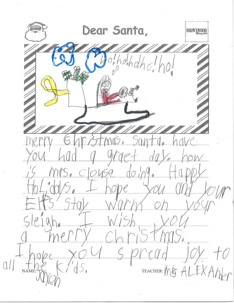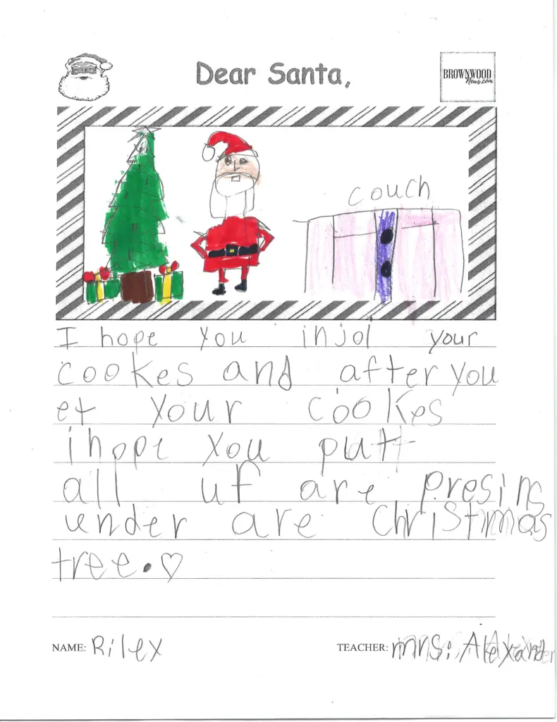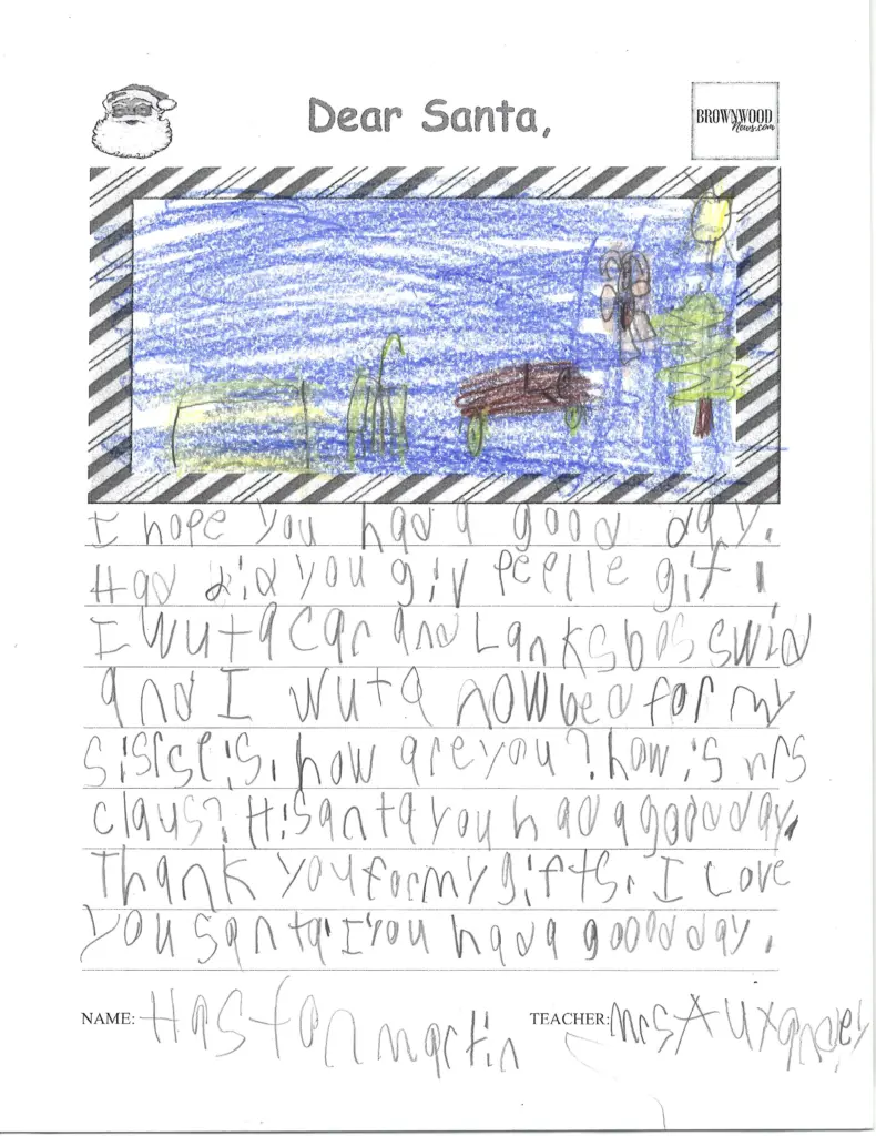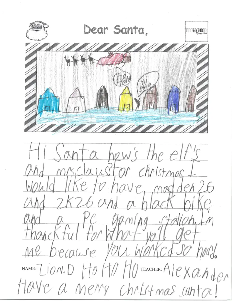 LETTERS TO SANTA: Woodland Heights Elementary December 21, 2025 at 6:45 am Updated: December 23rd, 2025 at 7:38 am Derrick Stuckly Local News Tweet Share Reddit +1 Pocket LinkedIn The BrownwoodNews.com annual holiday tradition continues as Brown County students share their Christmas wishes with Santa Claus: wh-2nd-alexander-17 wh-2nd-alexander-16 wh-2nd-alexander-15 wh-2nd-alexander-14 wh-2nd-alexander-13 wh-2nd-alexander-12 wh-2nd-alexander-11 accel-health-2023-copy wh-2nd-alexander-10 wh-2nd-alexander-9 wh-2nd-alexander-8 wh-2nd-alexander-7 wh-2nd-alexander-6 wh-2nd-alexander-5 wh-2nd-alexander-4 wh-2nd-alexander-3 wh-2nd-alexander-2 wh-2nd-alexander-1 wh-1st-morton-16 wh-1st-morton-15 « Previous123...13Next »