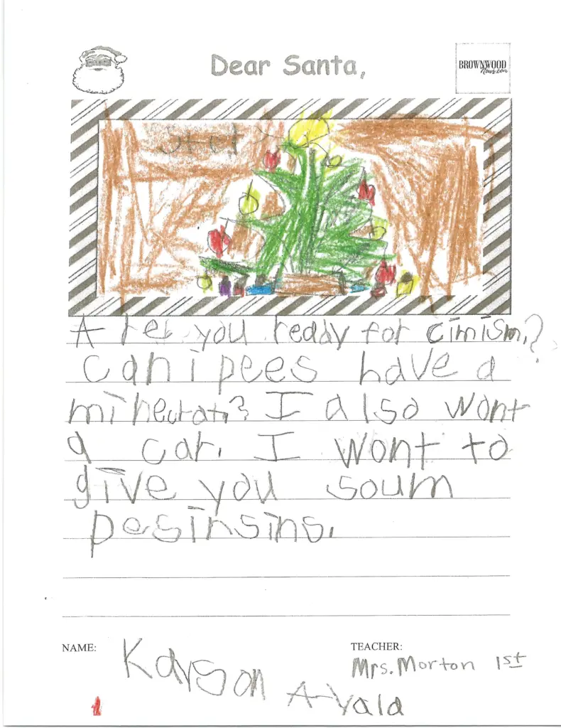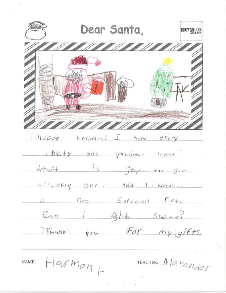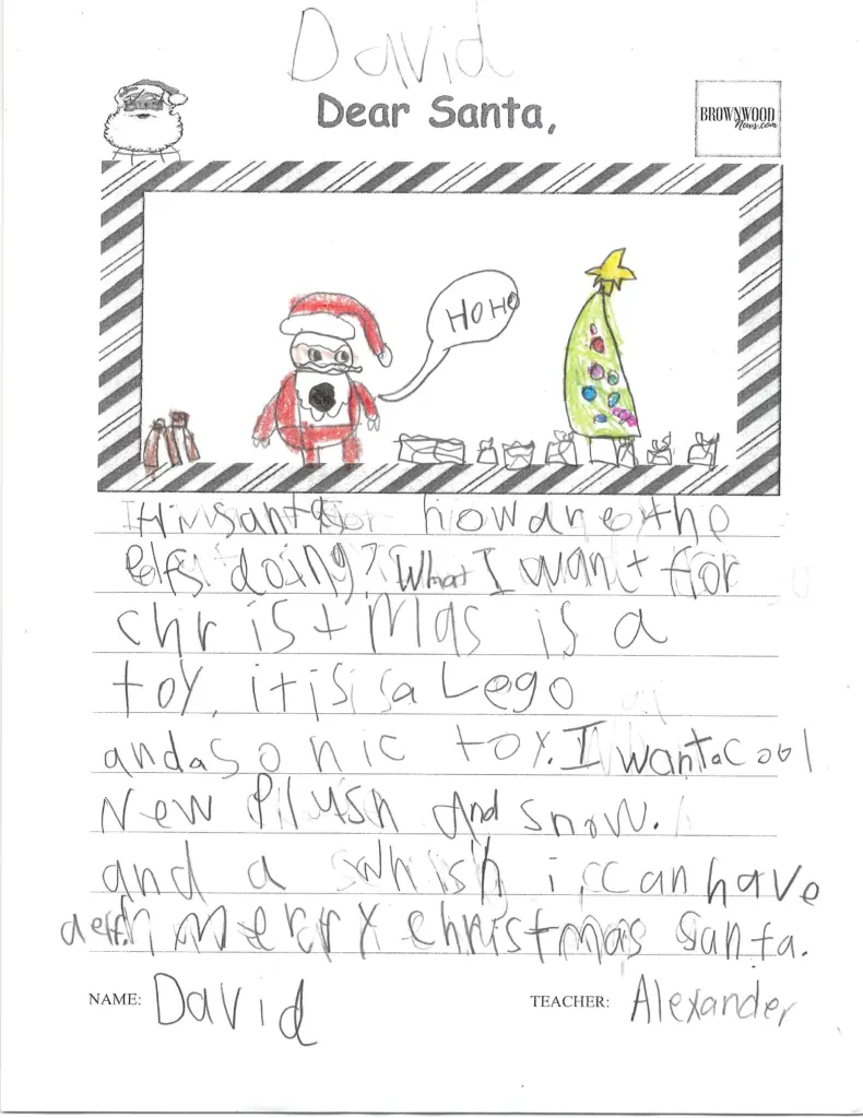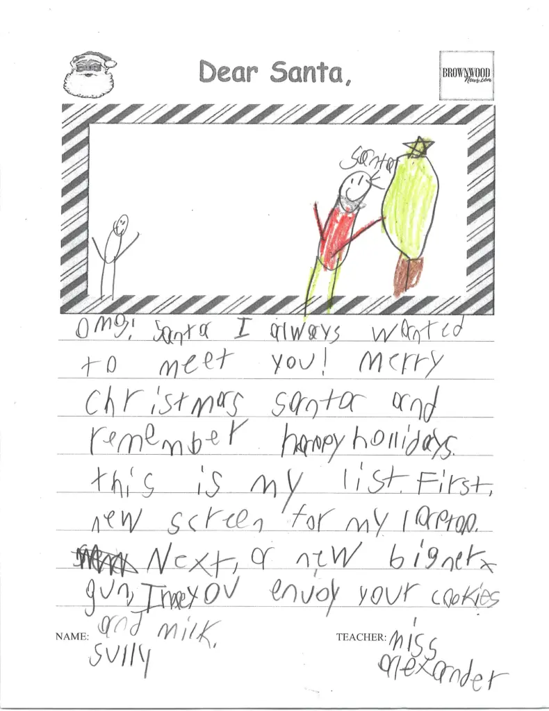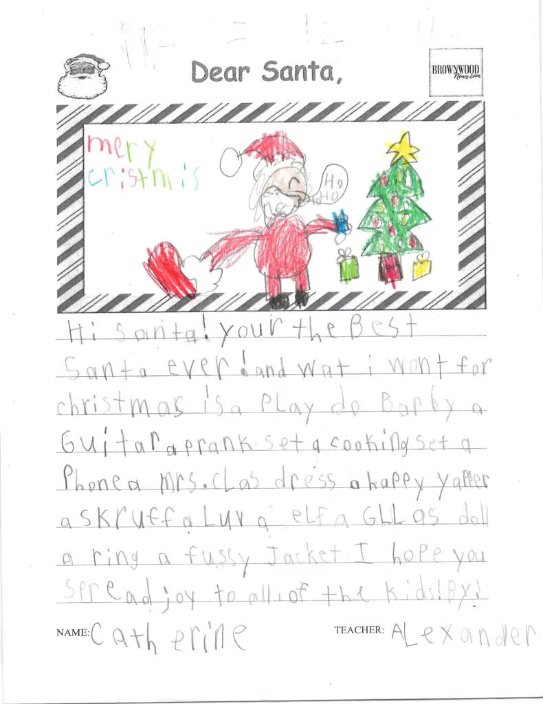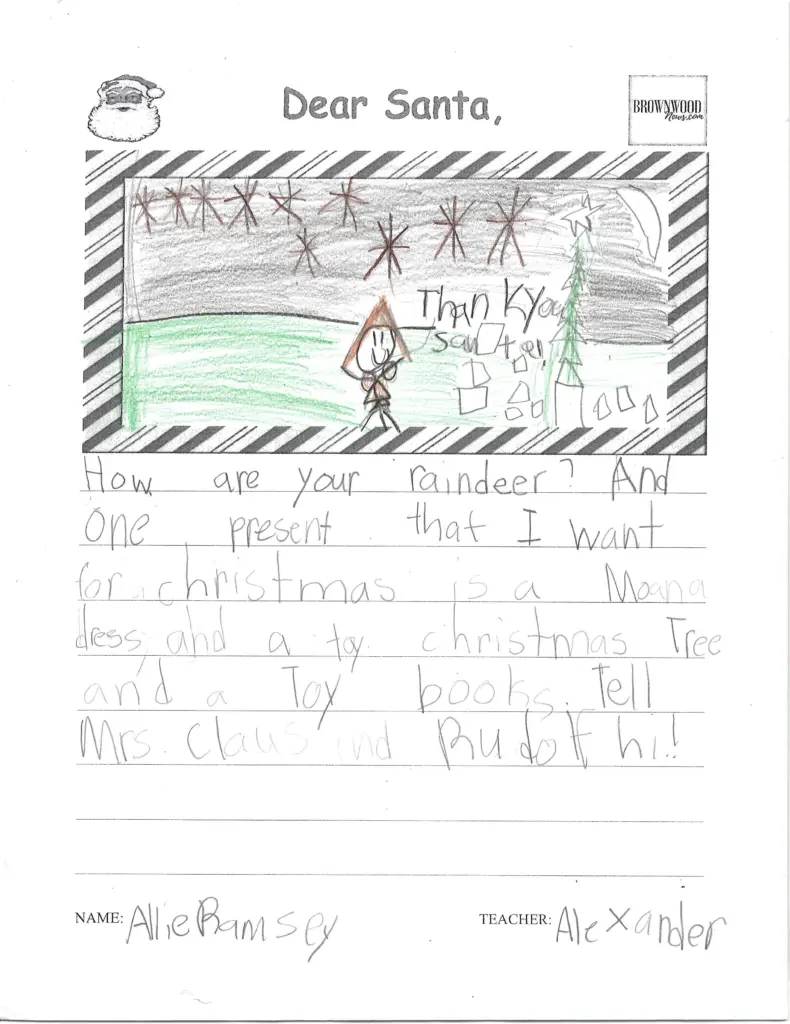LETTERS TO SANTA: Woodland Heights Elementary December 21, 2025 at 6:45 am Updated: December 23rd, 2025 at 7:38 am Derrick Stuckly Local News Tweet Share Reddit +1 Pocket LinkedIn The BrownwoodNews.com annual holiday tradition continues as Brown County students share their Christmas wishes with Santa Claus: wh-2nd-alexander-17 wh-2nd-alexander-16 wh-2nd-alexander-15 wh-2nd-alexander-14 wh-2nd-alexander-13 wh-2nd-alexander-12 wh-2nd-alexander-11 accel-health-2023-copy wh-2nd-alexander-10 wh-2nd-alexander-9 wh-2nd-alexander-8 wh-2nd-alexander-7 wh-2nd-alexander-6 wh-2nd-alexander-5 wh-2nd-alexander-4 wh-2nd-alexander-3 wh-2nd-alexander-2 wh-2nd-alexander-1 wh-1st-morton-16 wh-1st-morton-15 « Previous123...13Next »
