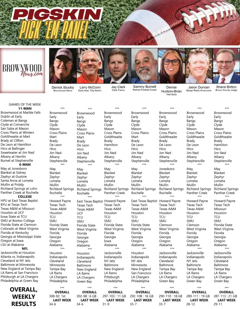 Pick ‘Em Panel – Week 11 November 6, 2025 at 11:54 am Derrick Stuckly High School Football Local News Tweet Share Reddit +1 Pocket LinkedIn New for the 2025 football season, BrownwoodNews.com presents its Pigskin Pick ‘Em Panel, as 14 Brown County residents each week will give their best guesses at 40 high school, college and pro football games: