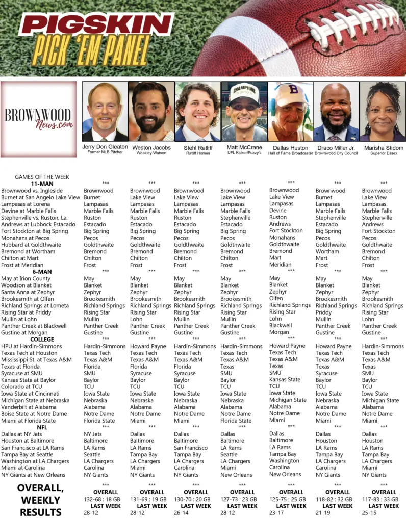 Pick ‘Em Panel – Week 6 October 2, 2025 at 12:02 pm Updated: October 2nd, 2025 at 4:08 pm Derrick Stuckly High School Football Local News Tweet Share Reddit +1 Pocket LinkedIn New for the 2025 football season, BrownwoodNews.com presents its Pigskin Pick ‘Em Panel, as 14 Brown County residents each week will give their best guesses at 40 high school, college and pro football games: