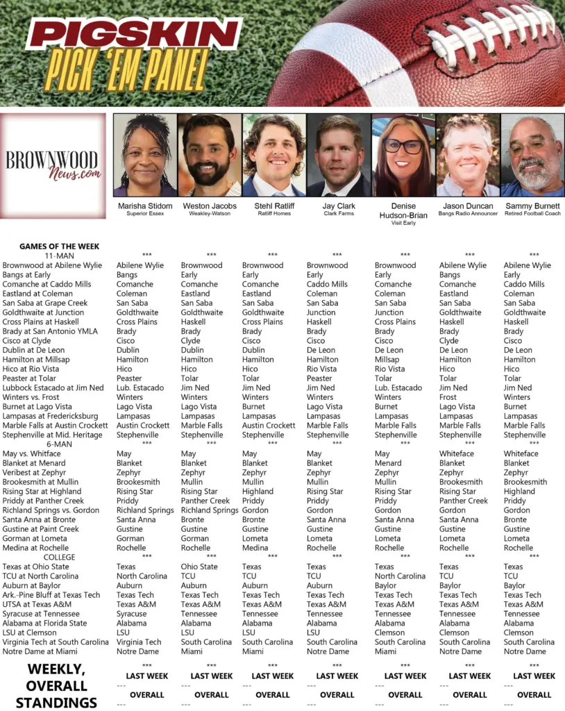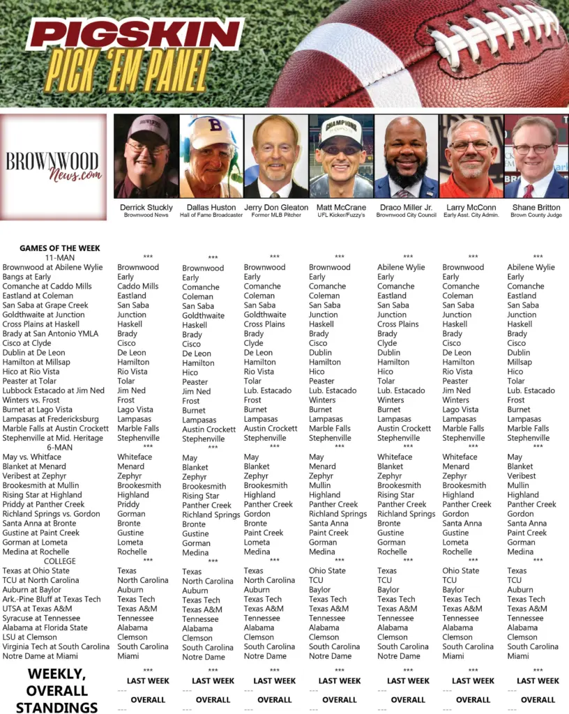 Pigskin Pick ‘Em Panel – Week 1 August 28, 2025 at 12:00 pm Derrick Stuckly High School Football Local News Tweet Share Reddit +1 Pocket LinkedIn New for the 2025 football season, BrownwoodNews.com presents its Pigskin Pick ‘Em Panel, as 14 Brown County residents each week will give their best guesses at 40 high school, college and pro football games:
