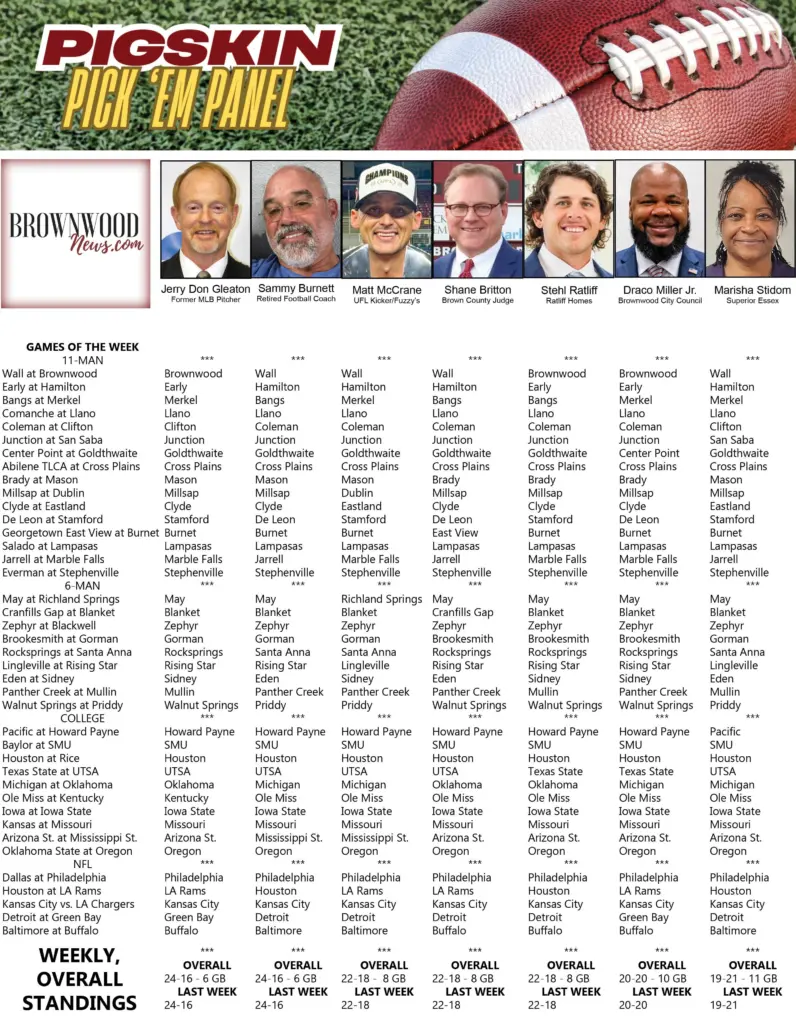 Pigskin Pick ‘Em Panel – Week 2 September 4, 2025 at 12:09 pm Derrick Stuckly High School Football Local News Tweet Share Reddit +1 Pocket LinkedIn New for the 2025 football season, BrownwoodNews.com presents its Pigskin Pick ‘Em Panel, as 14 Brown County residents each week will give their best guesses at 40 high school, college and pro football games:
