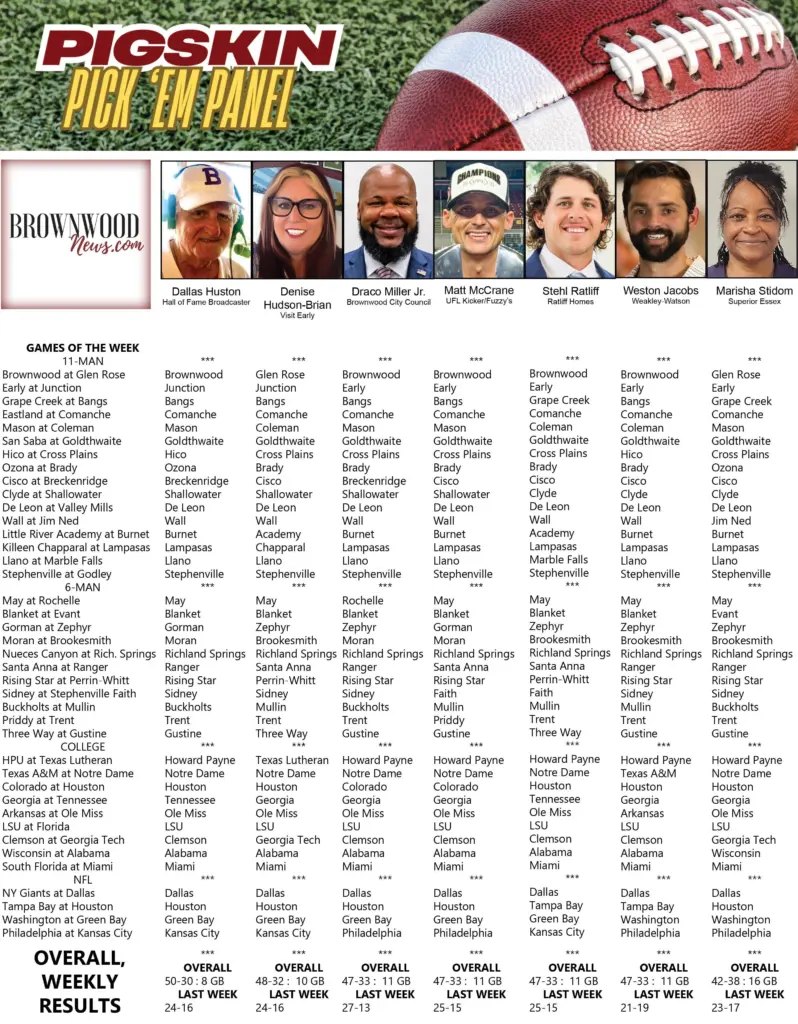 Pigskin Pick ‘Em Panel – Week 3 September 11, 2025 at 2:03 pm Derrick Stuckly High School Football Local News Tweet Share Reddit +1 Pocket LinkedIn New for the 2025 football season, BrownwoodNews.com presents its Pigskin Pick ‘Em Panel, as 14 Brown County residents each week will give their best guesses at 40 high school, college and pro football games: