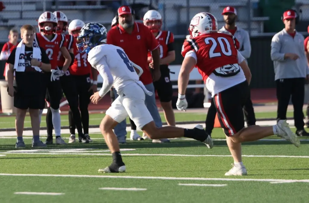 Oglesby extended the lead to 14-6 on a 20-yard scoring toss from Goff to Abram Shaw, but Richland Springs – which scored on every offensive possession – answered with an 8-yard touchdown run by Ethridge, and Ethan Deeds’ two-point kick knotted the score at 14 with 1:51 left in the first period.