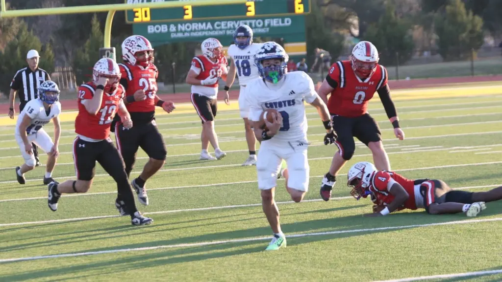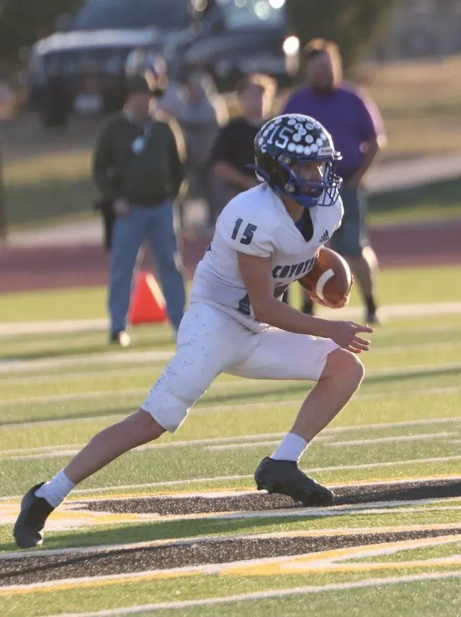 Ethridge then returned the opening kick of the second half 72 yards to set up a 1-yard Perry plunge; Perry scored again from 1 yard out at the 3:41 mark; then after Deeds’ second interception at Richland Springs 4, the Coyotes drove 76 yards in four plays with Ethridge sprinting the final 51 yards to end the contest.